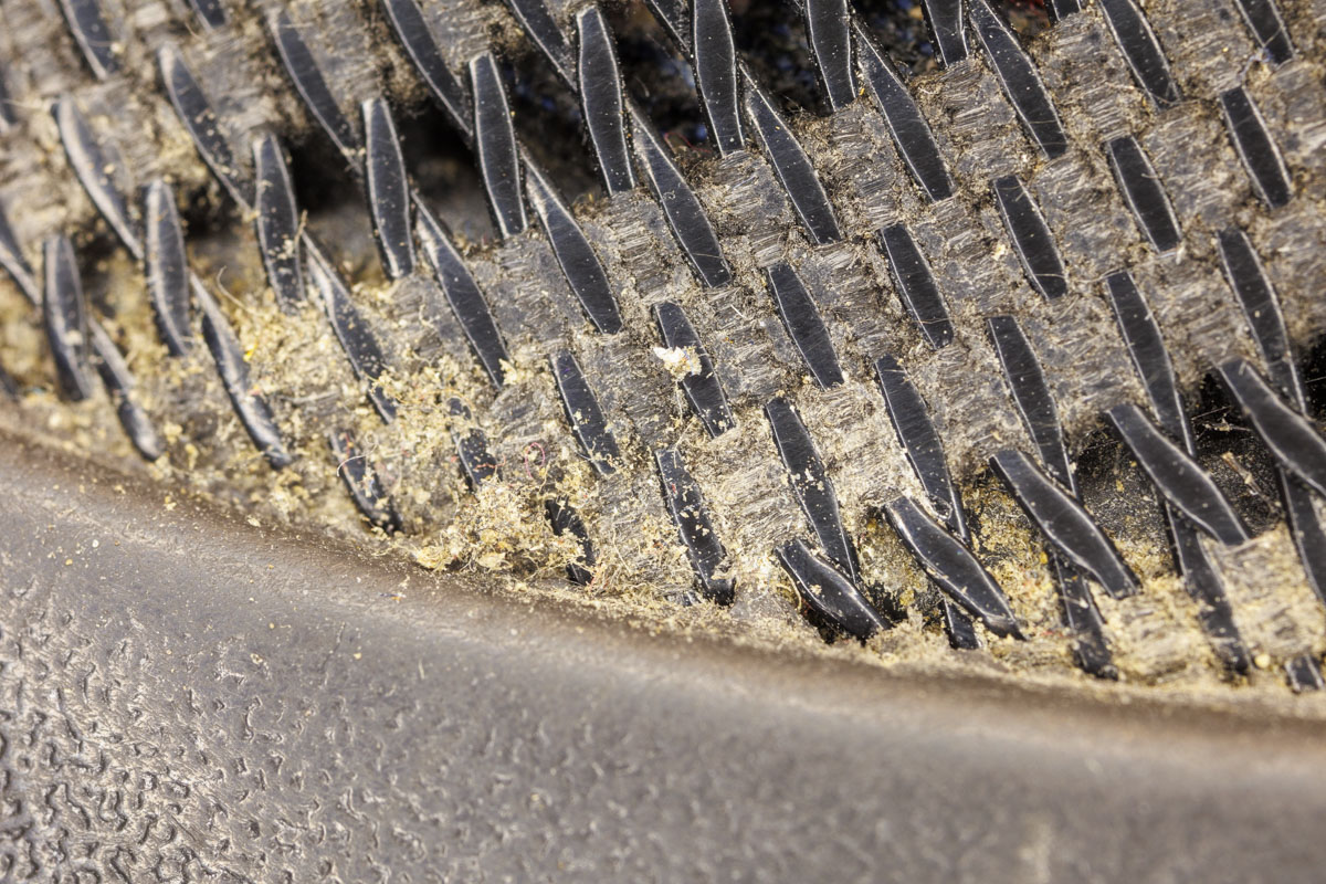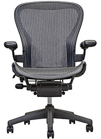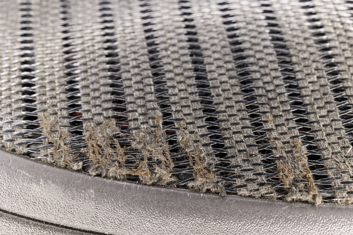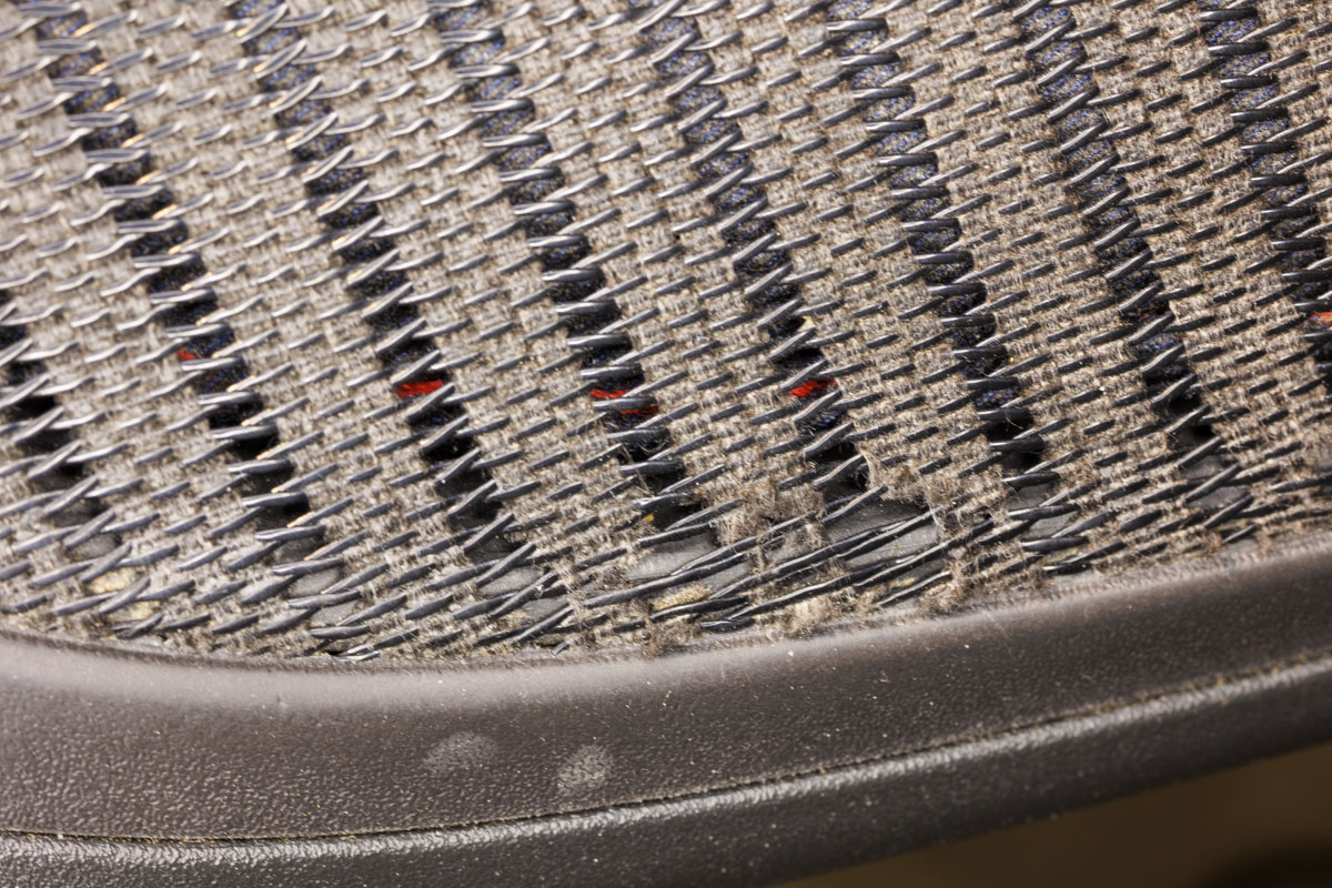 The Herman Miller Aeron chair requires using tweezers,brushing away and using detergent to get rid of gunk. I used thread to try to halt the mesh from further damage.