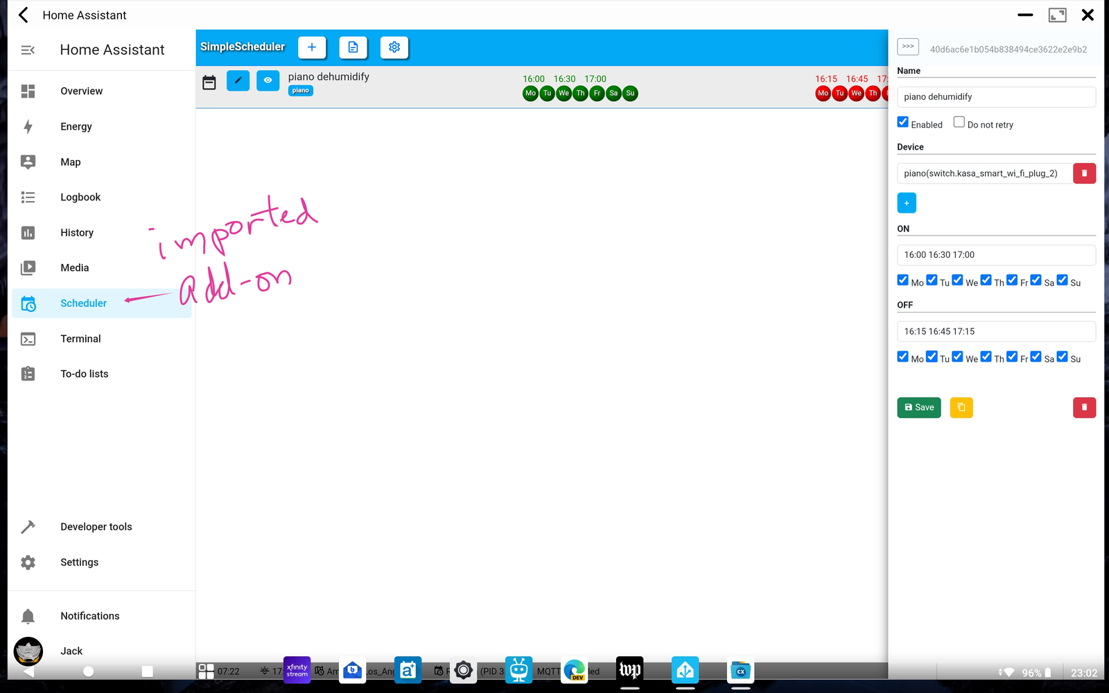 October to December 2025 - Started to tear down and rebuild the fence (typical picture frame good neighbor redwood) one panel at a time and just finished a few days before Christmas. While Home Depot has better stuff than Lowe’s, Sunnyvale Lumber has even better stuff at premimum prices. Replaced a tankless noisy air compressor with a 2 gallon quiet compressor which looks to be a knockoff of the California Air Tools 2010A though a bit louder and slightly less capacity an d a Metabo HPT brad nailer. December 2023 - While drying persimmons in the forced warm air dehydrator, it worked best in the later stages with heating and cooldown cycles. As I had a TP-Link Kasa smart plug, I programmed various times like 20 minutes on/10 off with the Kasa/Tapo app on Android and iPadOS. We received a newer one for Christmas. Being curious about power usage, I bought a pack of 2 Kasa KP125M Matter smart plugs with energy monitoring. Striving for an easier way to program these in any 3rd party Android/iPadOS app failed. Home Assistant (HA) running on a Raspberry Pi 4 was the only program that would recognize these Matter devices. As with other vendors, Google Home required a physical hub. Apple Home needed a physical hub as changes to iPadOS 17 eliminated using it as a hub. It does work on an iPad Mini running 12.5.7 which allows setting on/off times, timers, when this/do that once bridged to HA. However this was more cumbersome than the Tapo app. Since HA is open source, doing a simple schedule was not so simple - tech savvy me couldn’t do this. However an add-on appropriately named SimpleScheduler solved this basic need. click picture for more